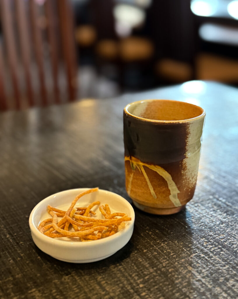 最初にお通しの揚げそばとそば茶をいただきました。