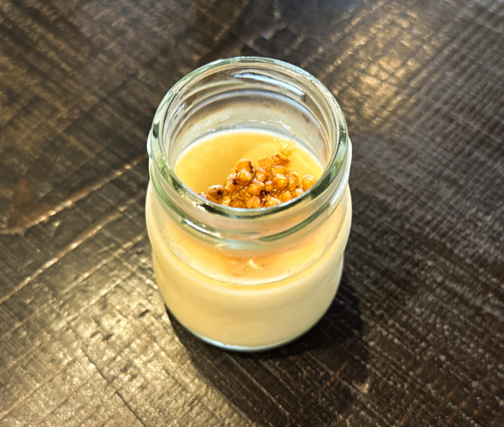 豆乳プリンに香ばしいそば茶ソースとそばあられがかけられています。