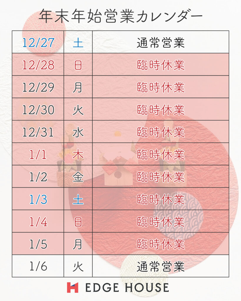 弊社は下記の期間中、年末年始休暇を頂戴いたします。なお、1月6月(火)からは通常通り10時より営業いたします。